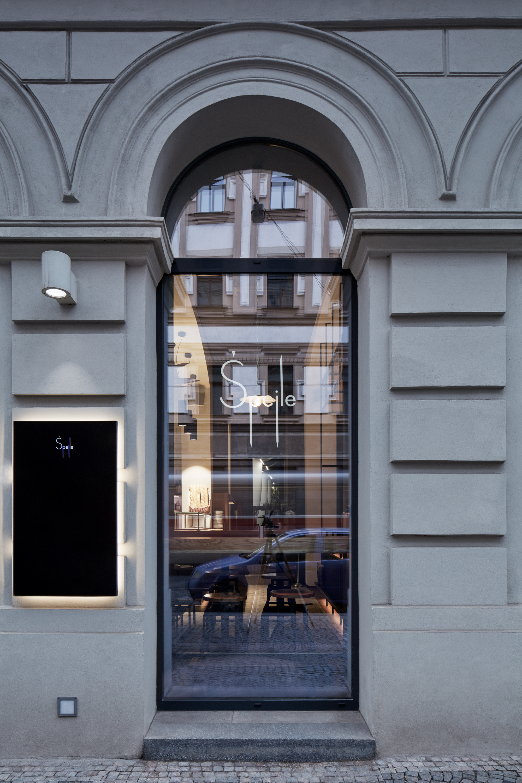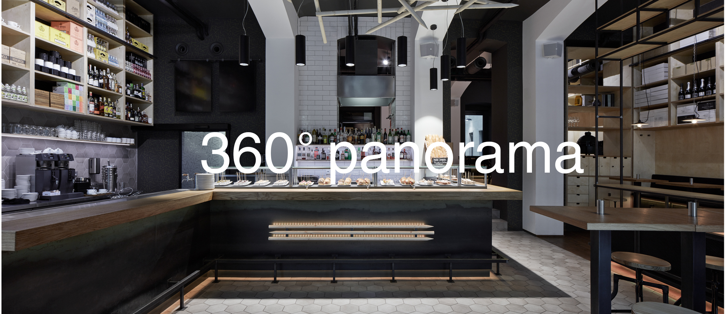 Merging the Czech “chlebíček” and the traditional Basque pintxos, new and proud food-spot was created on the emerging Prague's food scene. The restaurant offers a quick lunch for the busy day, as well as fine dining experience paired with assorted cocktails for the later eve. Challenge Nr 1 was to solve a little puzzle. The space that wasn’t meant for a restaurant and the client's task wasn’t the easiest of all: “The place has to work for breakfast, for lunch and even for a drink at night. The food is going to be diverse, served like “pinxtos” from the Basque country, but local and fresh. The look has to be simple. Let the food do the show.” We managed to win the invited competition with a spatial trick, that made it possible to connect to the kitchen in the basement and to present the full food parade on the 15 meter long bar. Challenge Nr 2 was to keep up with the pace the clients holded up. Be it the number of G&T’s consumed on the field trip to Barcelona, or the urge for the best that spired through all the process. It is not a coincidence that the clients run the best cocktail bar in downtown Prague. And last but not least, the challenge Nr 3, was to fulfill the proposed intention and to create a space that doesn’t overwhelm, feels natural and is variable enough to support multiple dining experiences. The original proposal was much lighter but wouldn’t work that good at night. After inspecting every other pinxtos establishment in Barcelona, we decided to bring up a darker scheme. The three distinct spaces are distinguished by little changes in the furniture, the “Front” is the quick one just for standing, the “Middle” is more serious with upholstered chairs and the “Garden” in the back is more playful. Tables are set under the trees and a light bulb chains. As an extra we were allowed two informal tables on the “Terrace” under the green wall in the atrium. The aim for simplicity cuts through the whole concept, there is no menu, all the food is exhibited and prepared freshly. The crew is there to take care of the guests, so they shouldn’t worry about anything else. The light and HVAC control is autonomous and to make the counting simple the price for every “špejle” is flat.