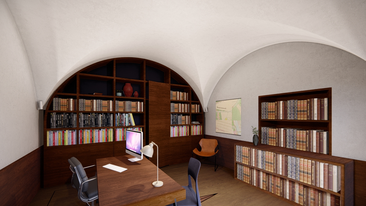 Návrh pojí historii s novými interiérovými zásahy. Vzniká jednotné prostředí, které propojují prvky teplého tmavého dřeva, světlých omítek v očištěných klenbách a kulatých rohů. Všemi místnostmi prochází dřevěné obložení stoupající do výšky parapetu, ze kterého vystupují truhlářské výrobky stolů, vestavěné police do nik a ostění pod okny a vytváří tak zvýšený sokl po obvodu všech místností. Do volného prostoru je jako solitér vložená zasedací místnost a plechové arbory pro práci s mapami.